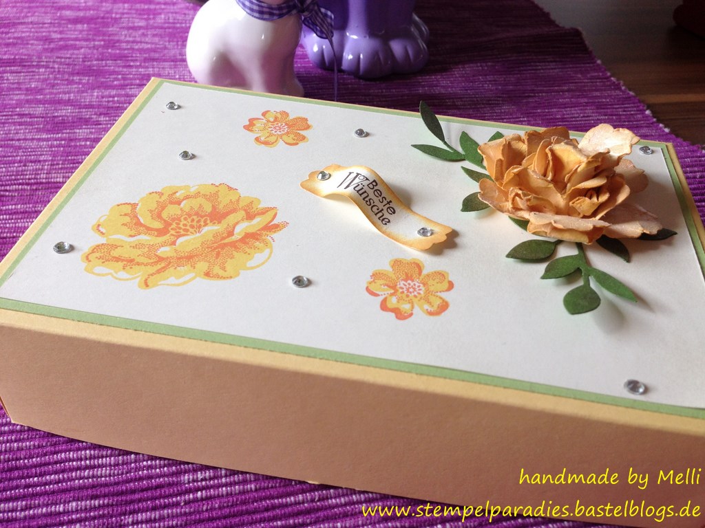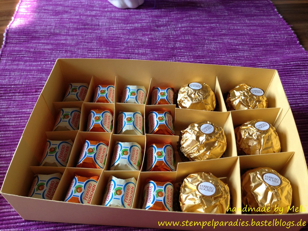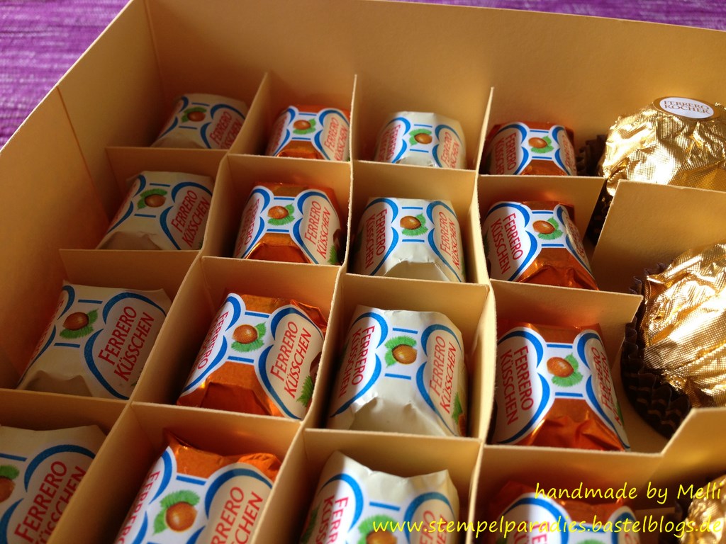Ich habe von meiner Psychologin einen ganz schönen Auftrag bekommen…sie brauchte für den 40.Geburtstag ihrer Schwägerin eine schöne Karte und eine passende Box für Küsschen und Rocher..die sollte größer sein und alles vereinen..