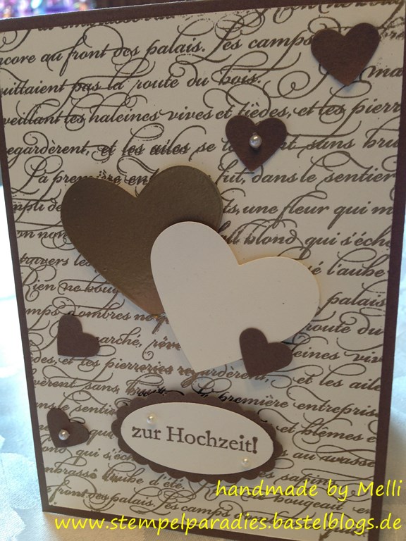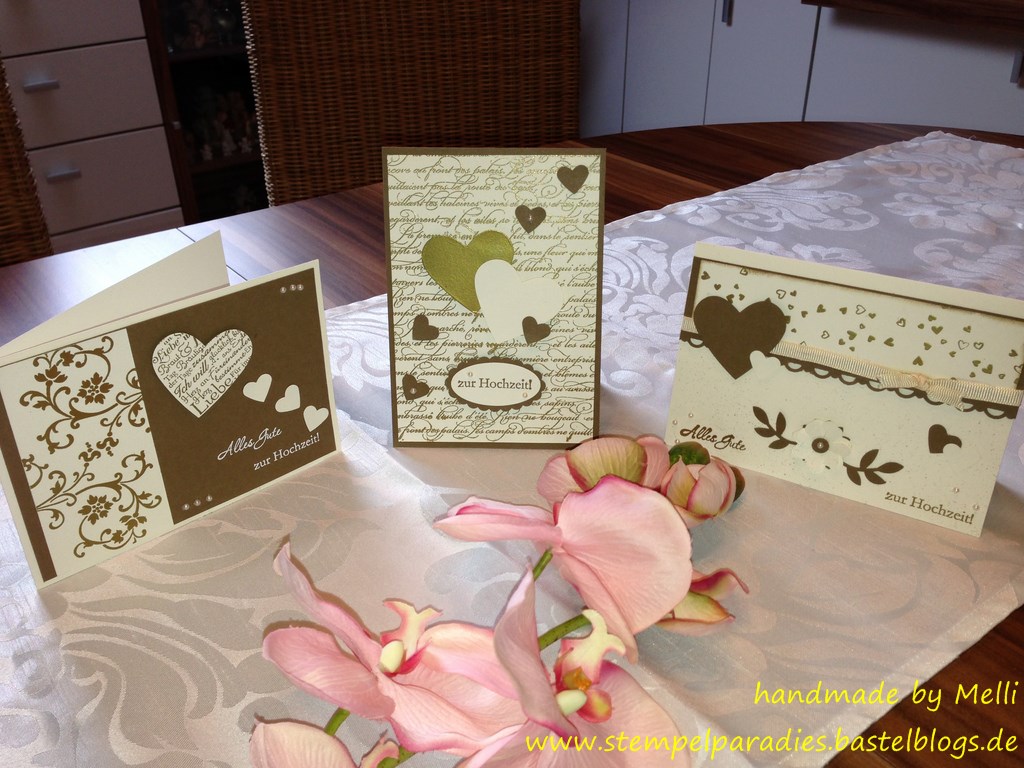 Ich habe mich heute morgen hingesetzt und 3 Karten gewerkelt..in den Farben Wildleder und Vanille und mit Gold verschiedene Akzente embossed.