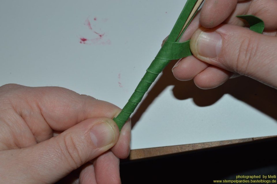 DSC_0042 (Kopie) ← Zurück Weiter → Jetzt nehmt ihr euch den dicken Streifen, macht ihn mit einem Falzbein geschmeidiger, fixiert ihn am Stielende mit Kleber und dreht ihn schräg über den Spieß..zum schluß wieder mit kleber fixieren. Ist ein bisschen Fummelarbeit.