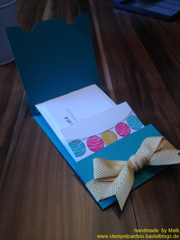 Dafür habe ich eine Karte gebastelt..in Bermudablau 🙂 wundert euch nicht über die Tombowflasche..die verdeckt nur den Gutscheincode 🙂