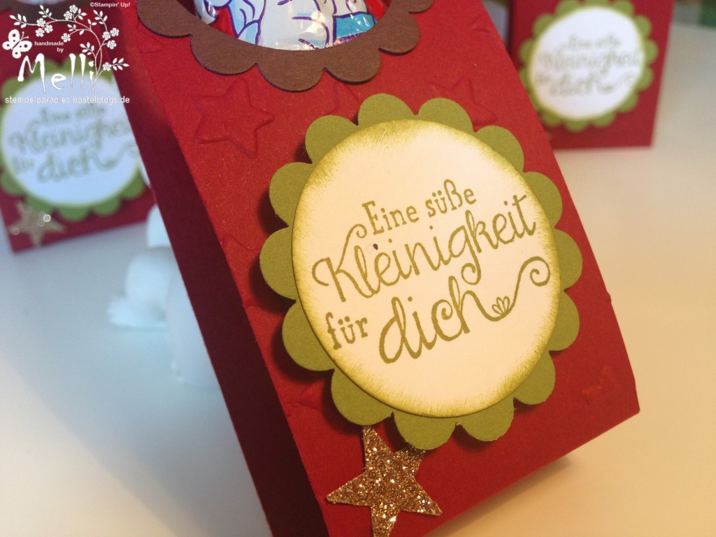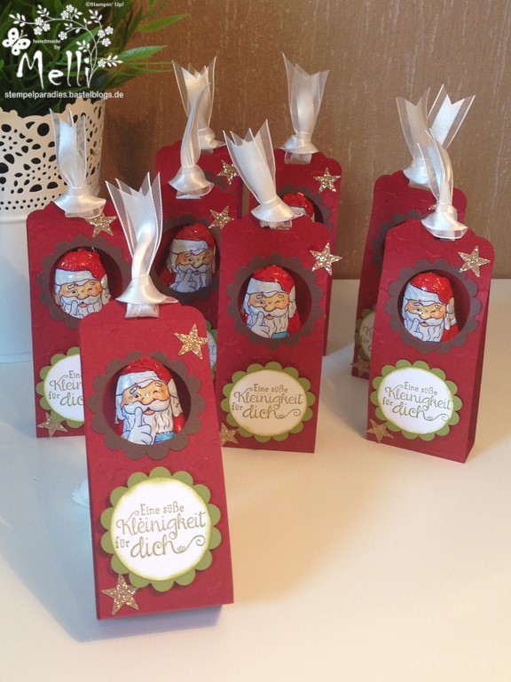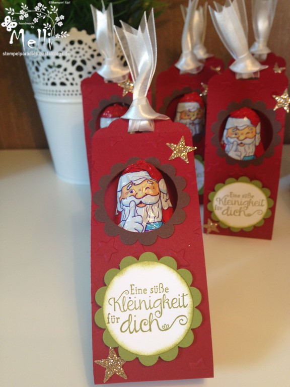 Ich habe einen Milka-Weihnachtsmann (deswegen zarteste Versuchung 🙂 ) in ein „Kleid“ gehüllt und verziert 🙂 Das Kleid ist mit der Anhänger Stanze gemacht in Chili..und mit dem Sternen-Prägefolder geprägt.