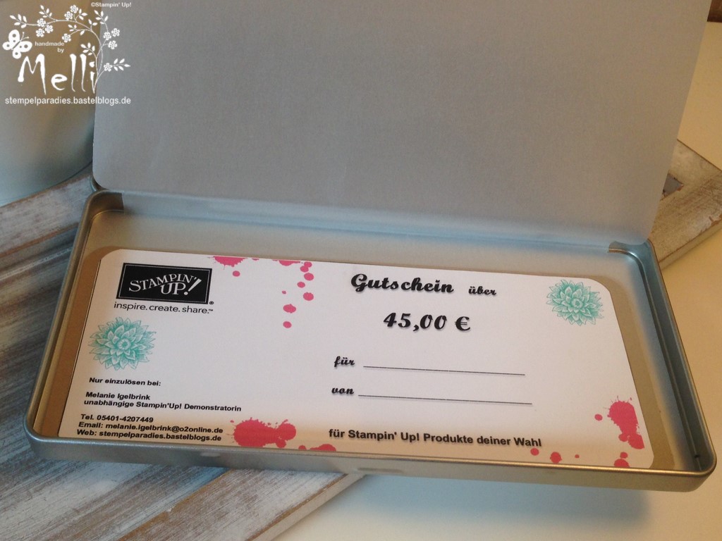 Ich wollte mal was ganz anderes machen, als nur einen Gutschein als Karte..und da ich noch kleine Metalldosen aus einer Sammelbestellung im Schrank hatte, habe ich einen „Gutschein in der Dose“ gemacht 🙂