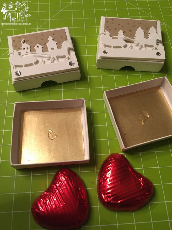 Stampin Up, Anleitung Schlittenfahrt, Goodie, Mellis Stempelparadies (9) (Kopie) ← Zurück Weiter → Nach dem Zusammenkleben der Schachtel noch den Goldboden einkleben und dann mit einem Glue Dot die Schoki einkleben
