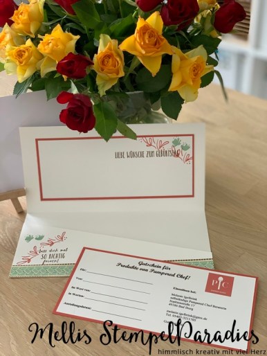 Auf jeden Fall wurde ich heute morgen angesprochen, ob ich nicht einen Gutschein für Pampered Chef Ware hätte und deswegen habe ich mich gleich hingesetzt und mit einigen Materialien aus dem neuen Katalog aber auch mit einigen altbewährten Materialien gearbeitet.
