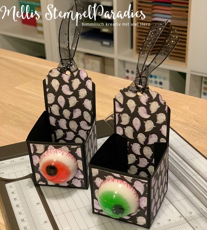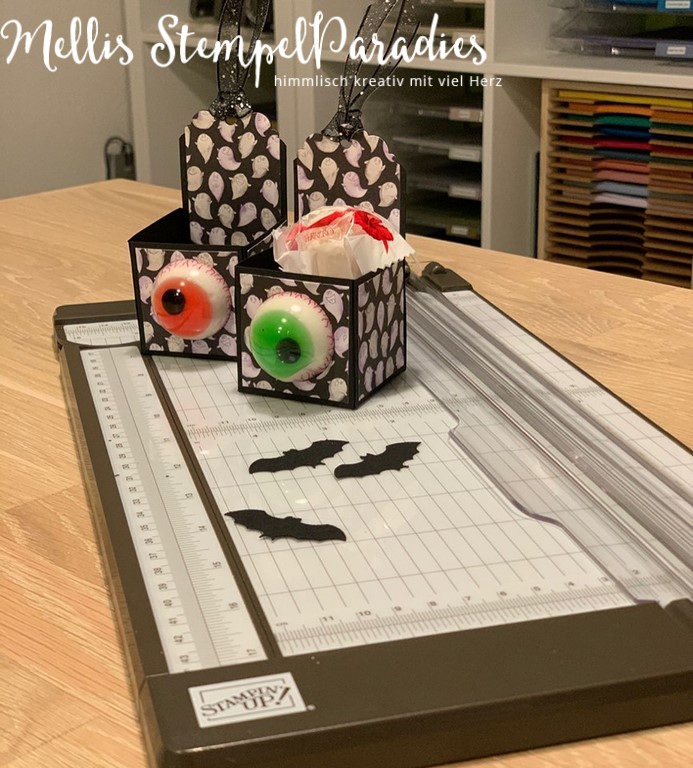 Vor 2 Wochen hatte ich meinen Stempelstammtisch und eine meiner Kundin hatte sich vorgenommen, für Halloween zu basteln. Sie hat so essbare Glupschaugen mit gebracht und wollte sie in einer Verpackung unterbringen und so habe ich ihr ein bisschen beim Schnippelm zur Seite gestanden und wir haben diese süße Verpackung fertig bekommen als Prototypen.
