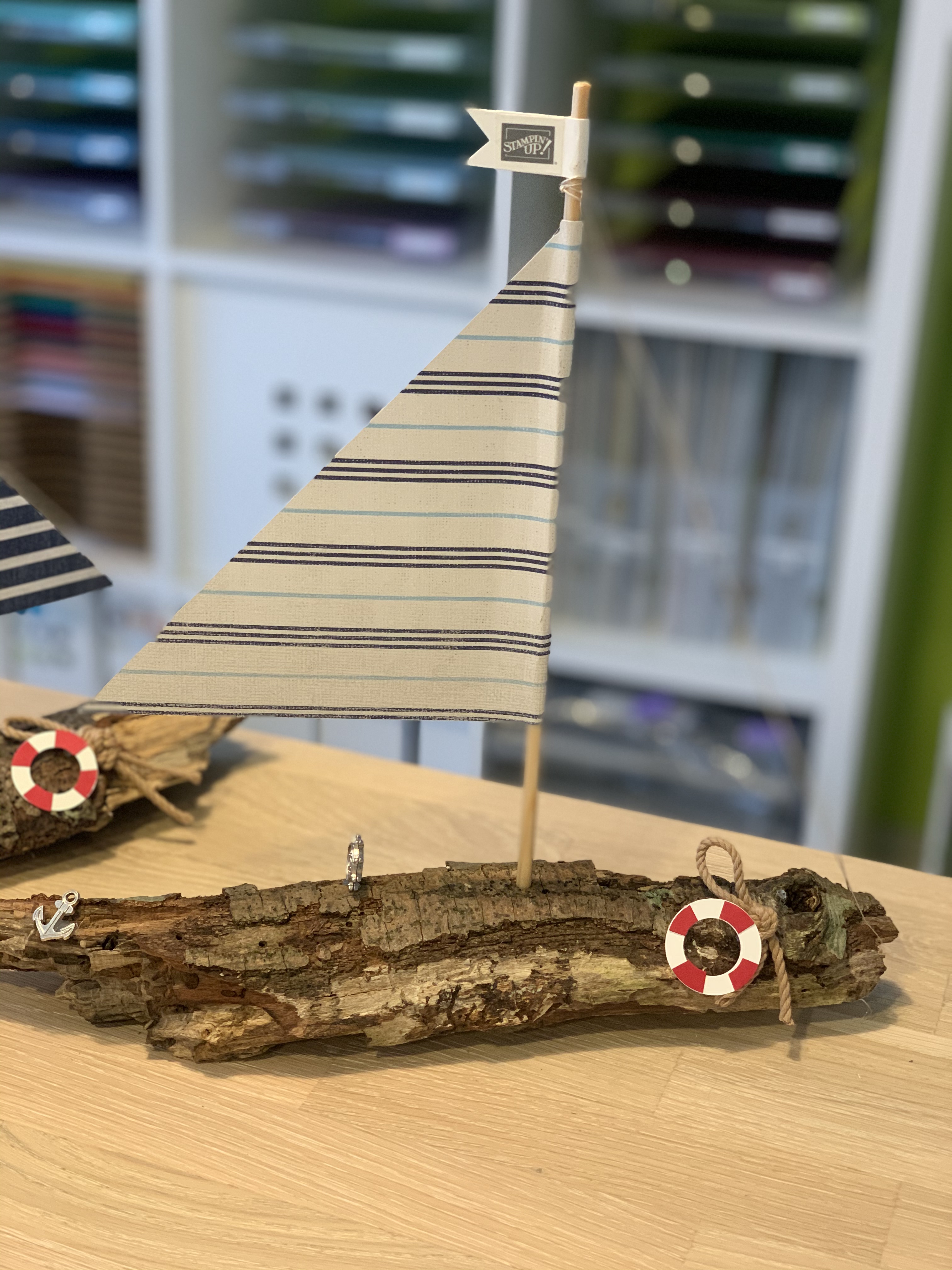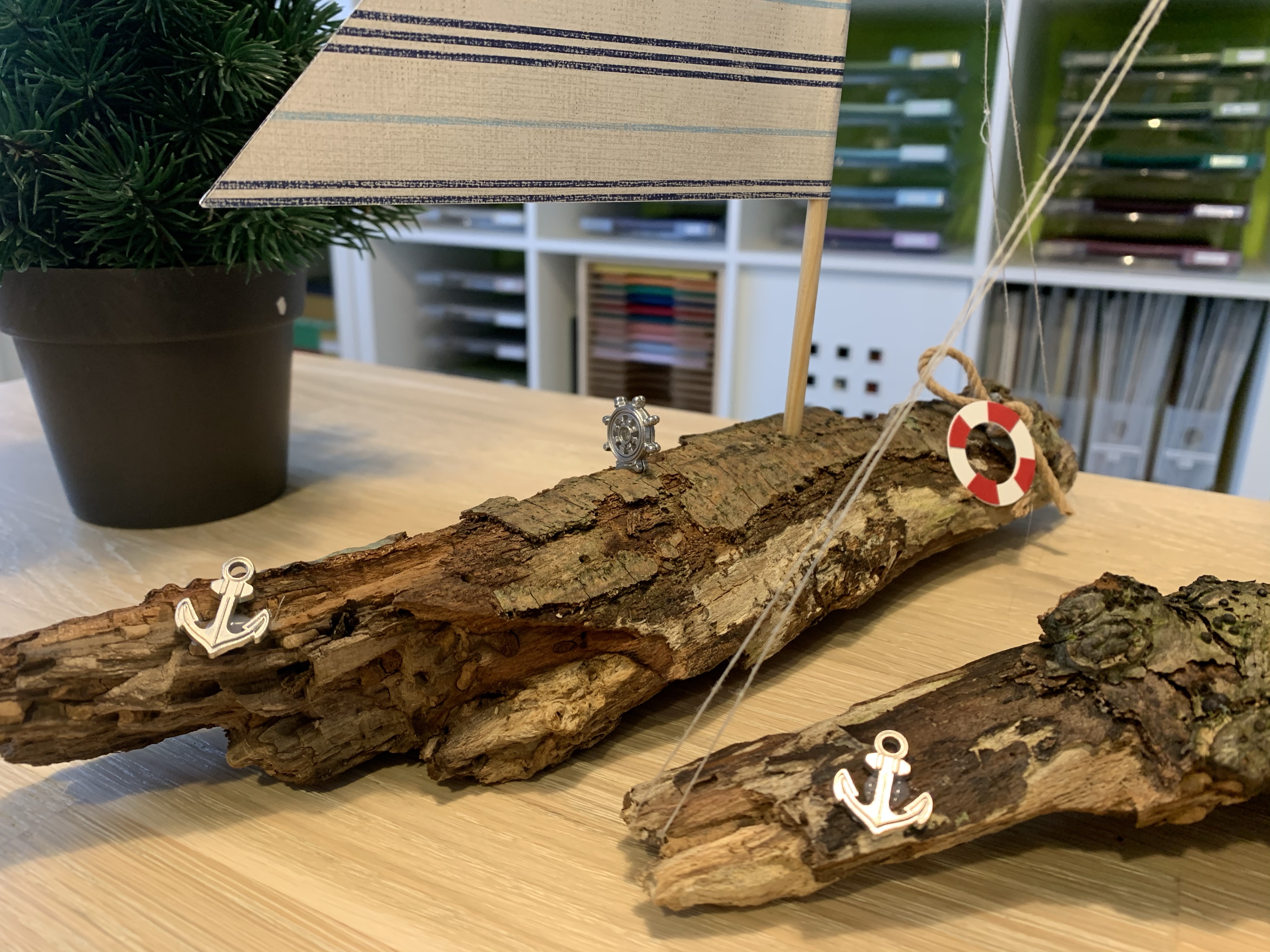 Die kleinen Schiffchen sind selbstgebaut… das Holz während des Gassi Gangs gesammelt und erstmal einige Zeit trocknen lassen und dann wurde ein Loch gebohrt, den Mast eingeklebt und dann ein Segel „gesetzt“😂 das stammt aus dem DSP Set „Meer der Möglichkeiten“ dann noch ein paar schöne Accessoires wie die kleinen Anhänger „Anker und Steuerrad“ aus der maritimen Reihe.