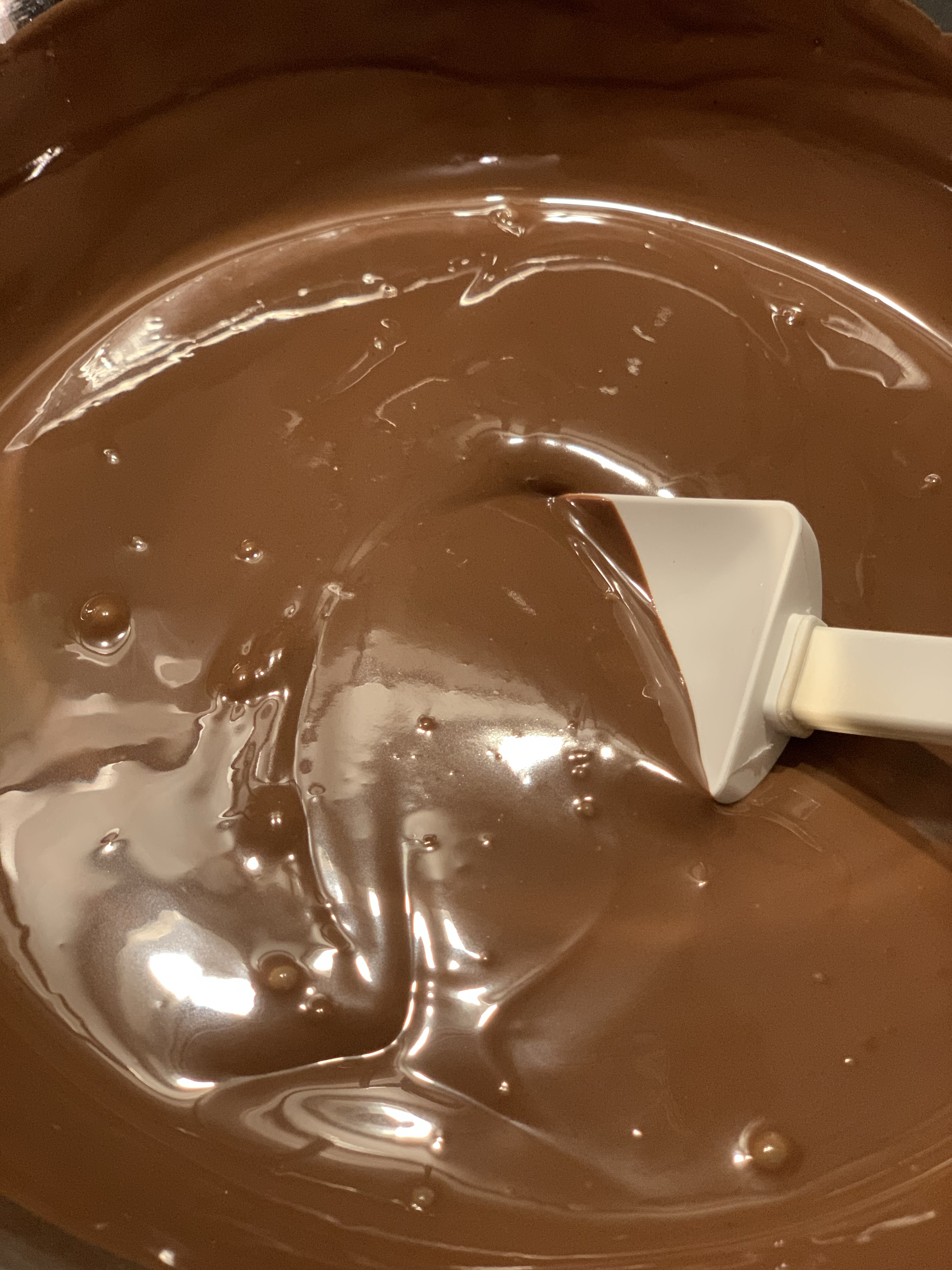 Es ist wichtig das die Schokolade nicht zu heiß oder zu kalt wird, also temperiert wird, damit die Schokolade nach dem erkalten nicht grau wird. Dann trennt sich das Fett. Sieht nicht sooo schön aus 😂