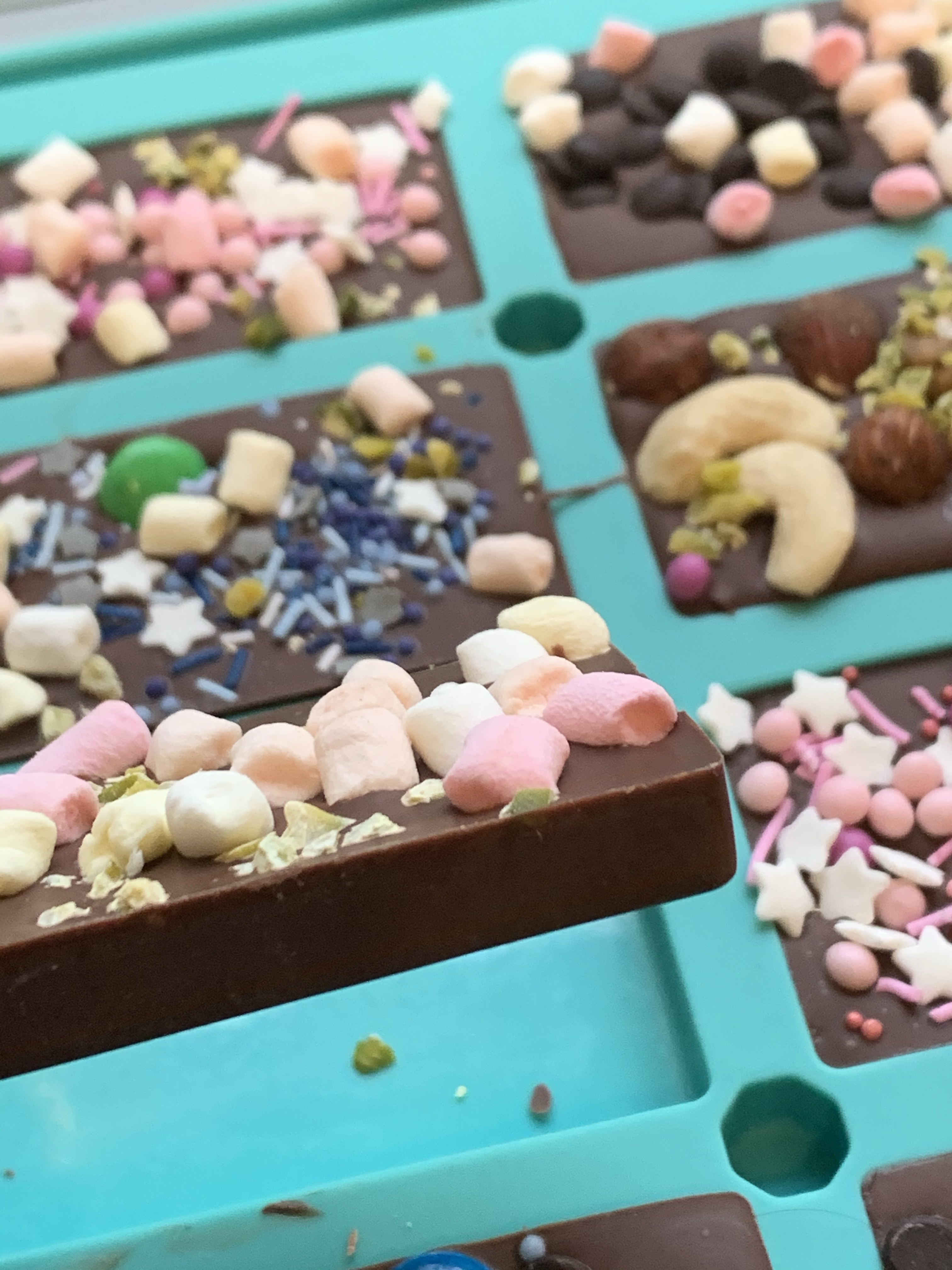 Dann füllt ihr die flüssige Schokolade in den Snackmaker und dekoriert sofort mit euren Toppings und lasst die Schokolade fest werden.