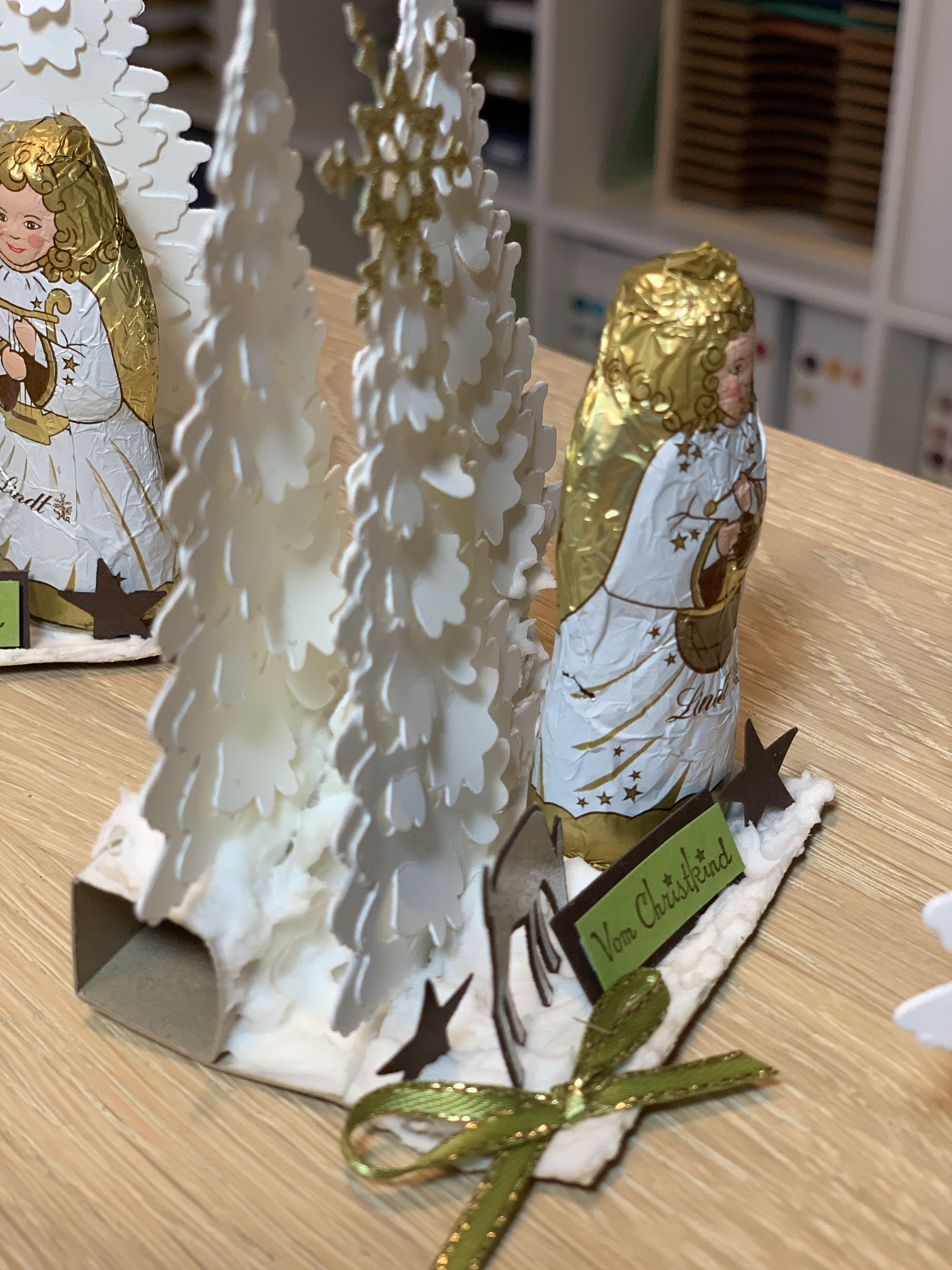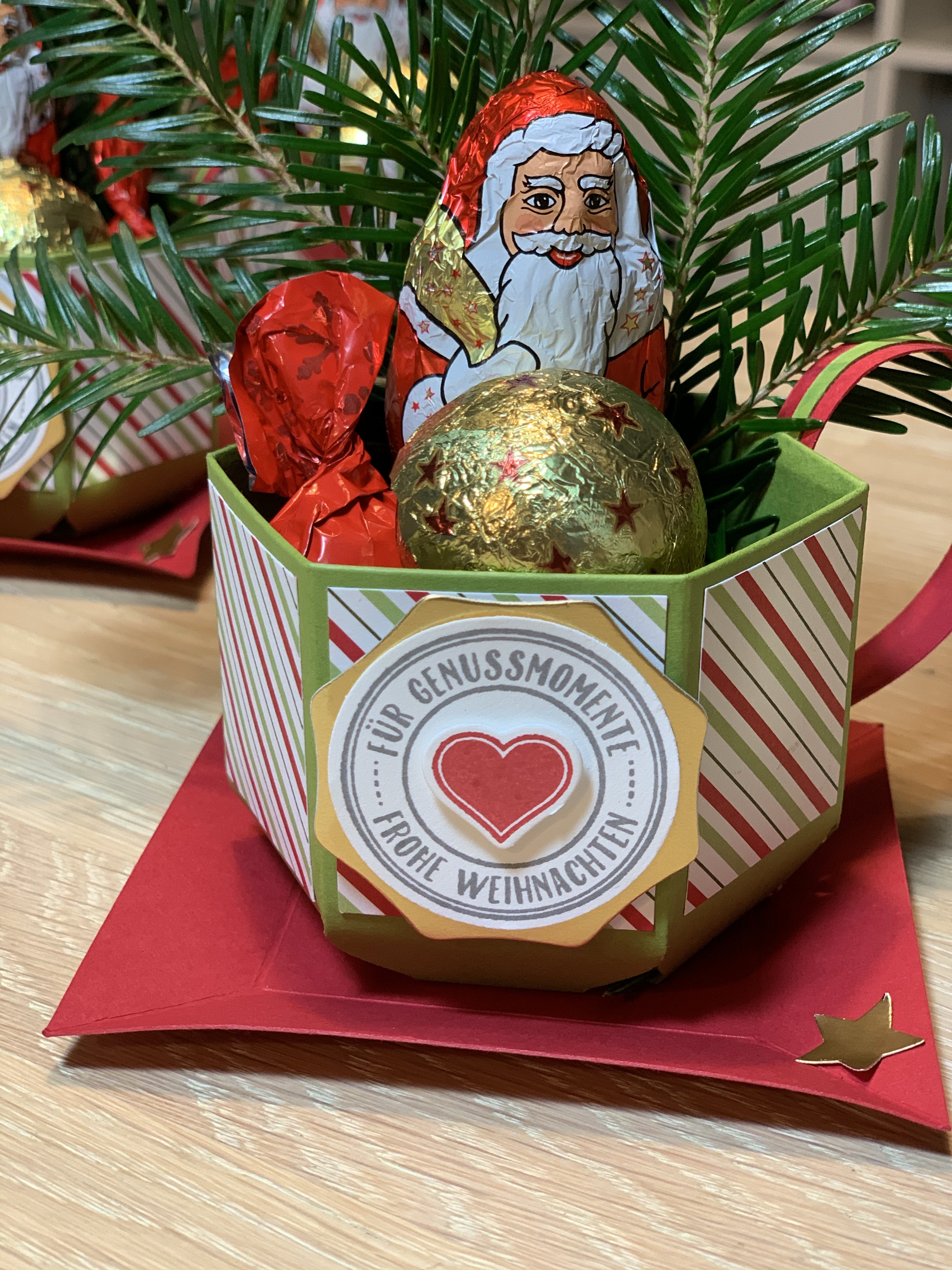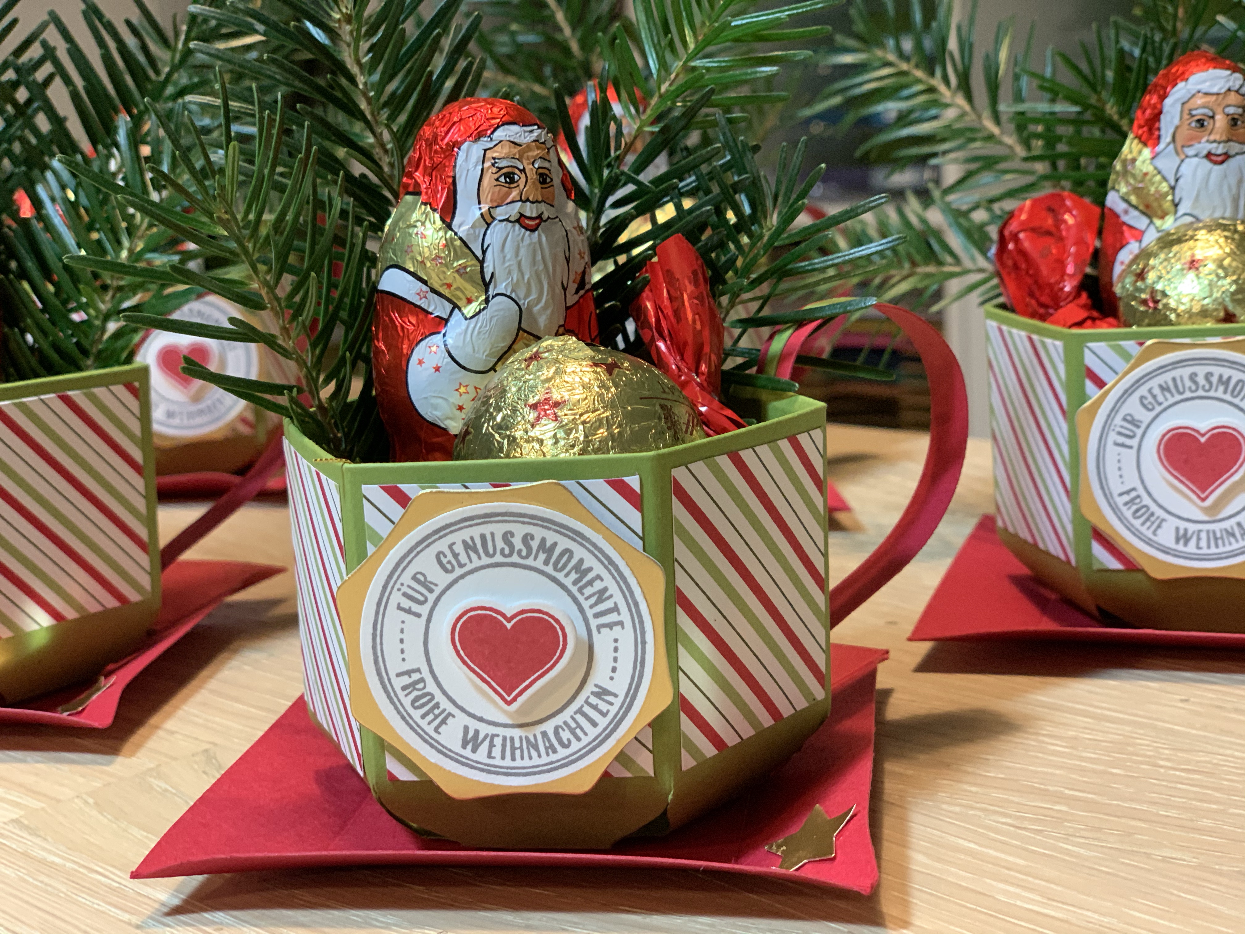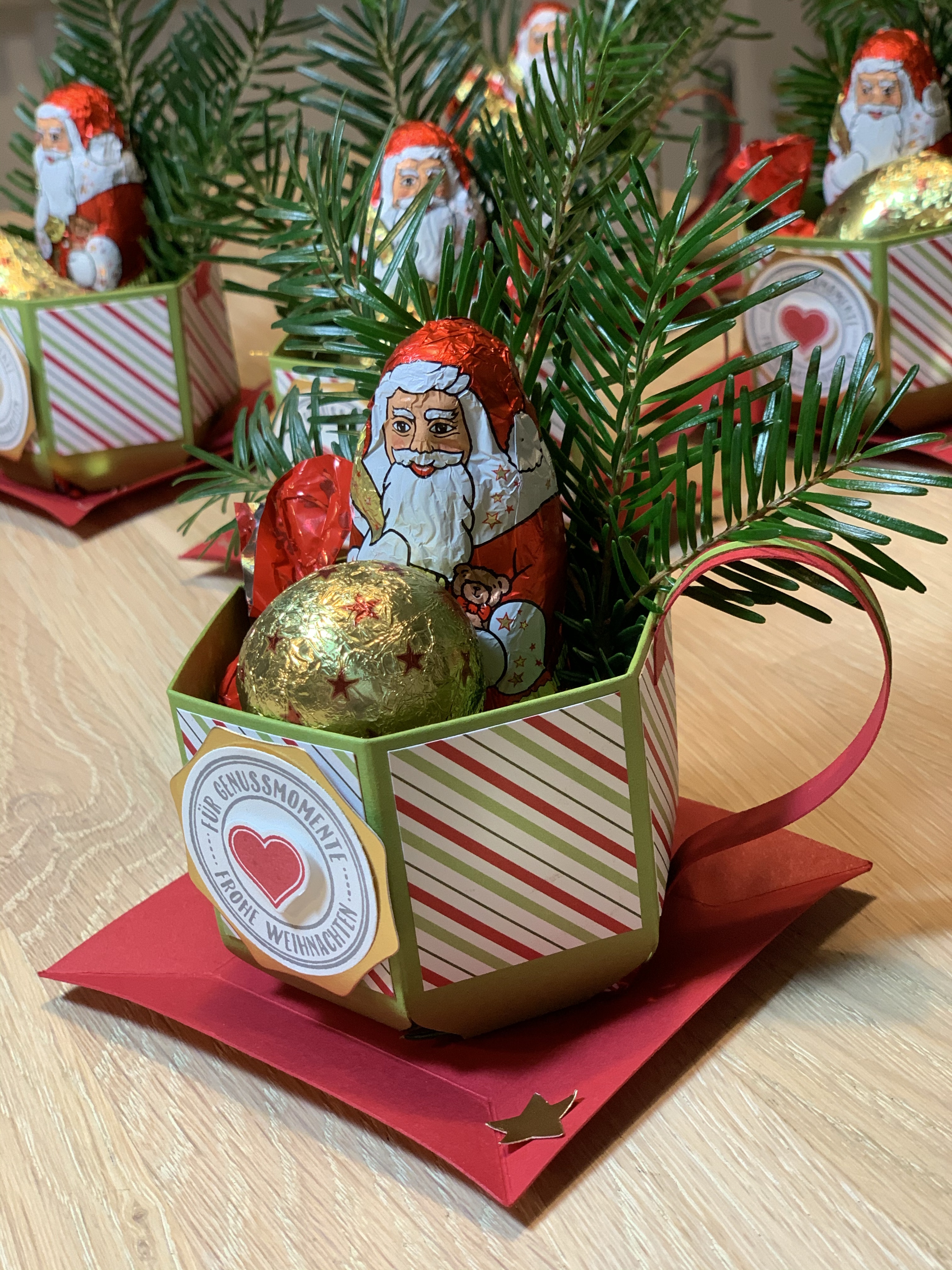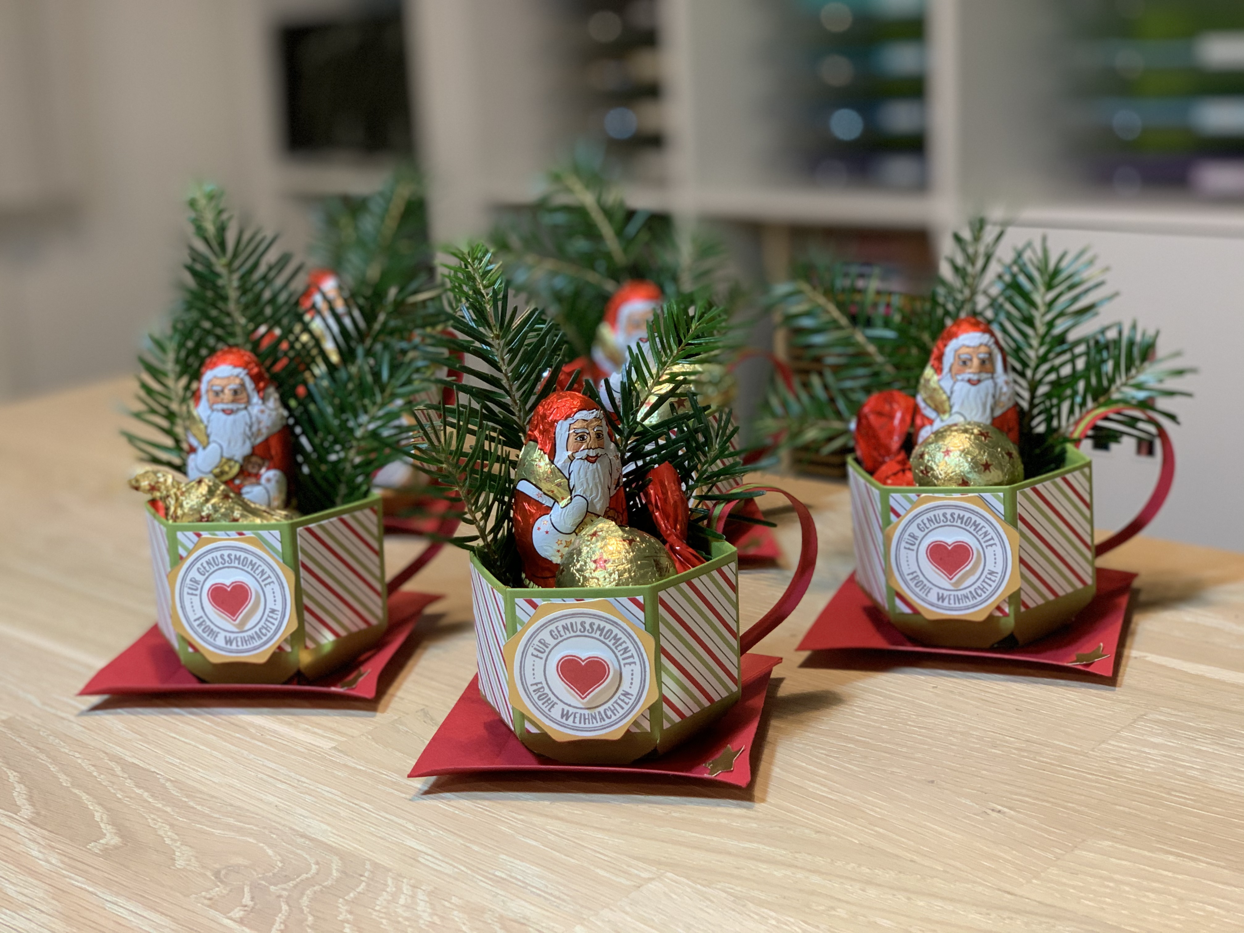 Und zwar habe ich kleine Lindt Weihnachtsmänner (Werbung!) und weitere Schoko in einer Tasse platziert, die ich mit meinem Punchboard für Umschläge gemacht habe. Das gibt es zwar von SU nicht mehr, aber von WR Memorykeepers.