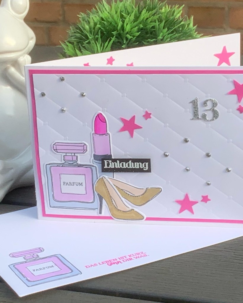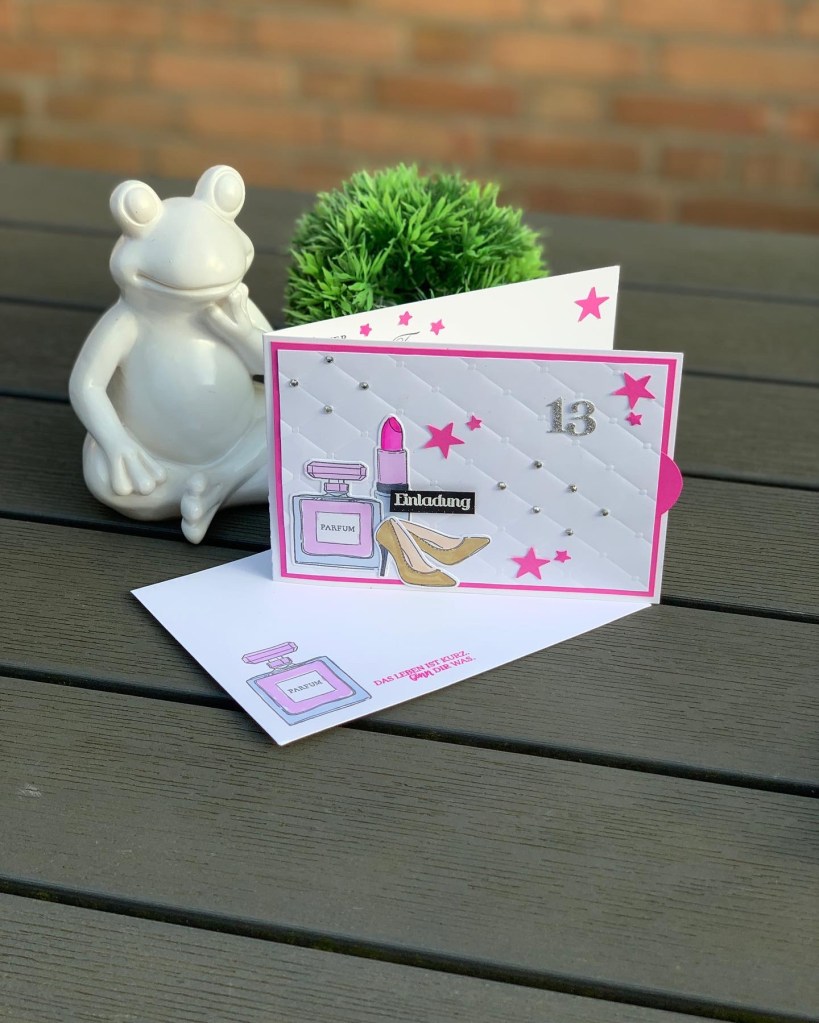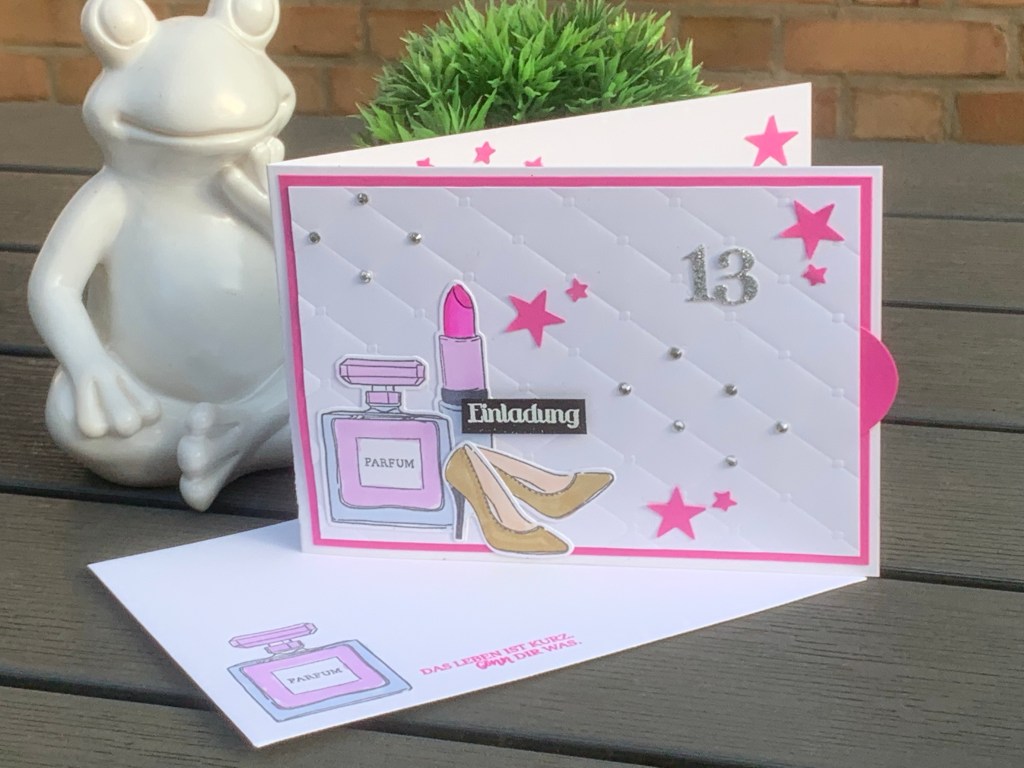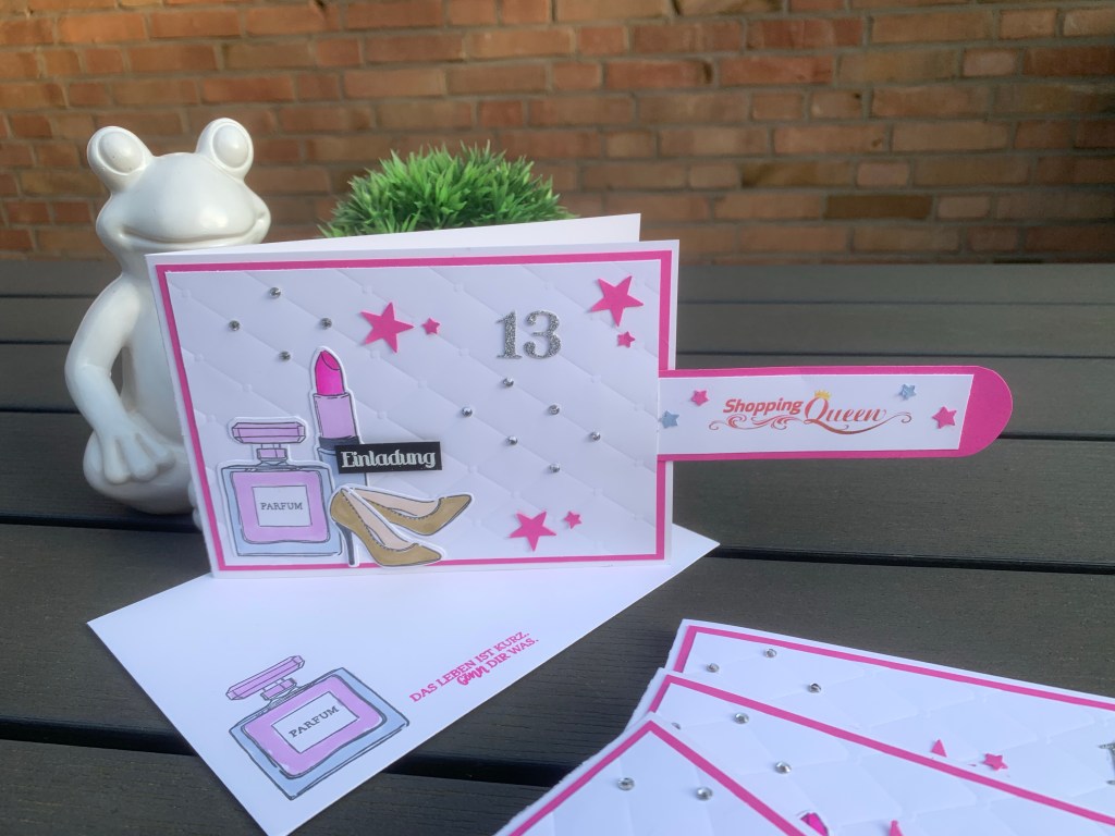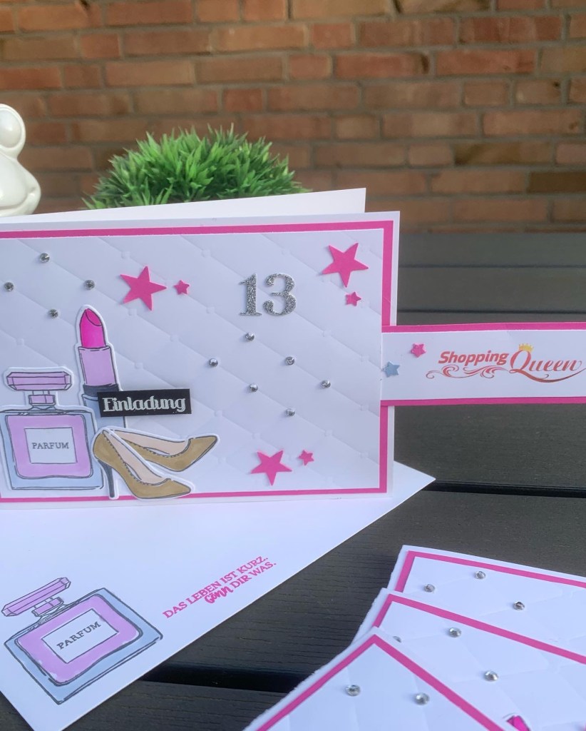 Es ging um eben 5 Einladungskarten für ein 13jähriges Mädel die gerne mit ihren Freundinnen an ihrem Geburtstag shoppen gehen möchte und die Einladung so im Shopping Queen Style haben möchte. Also richtig Mädchen ♥️