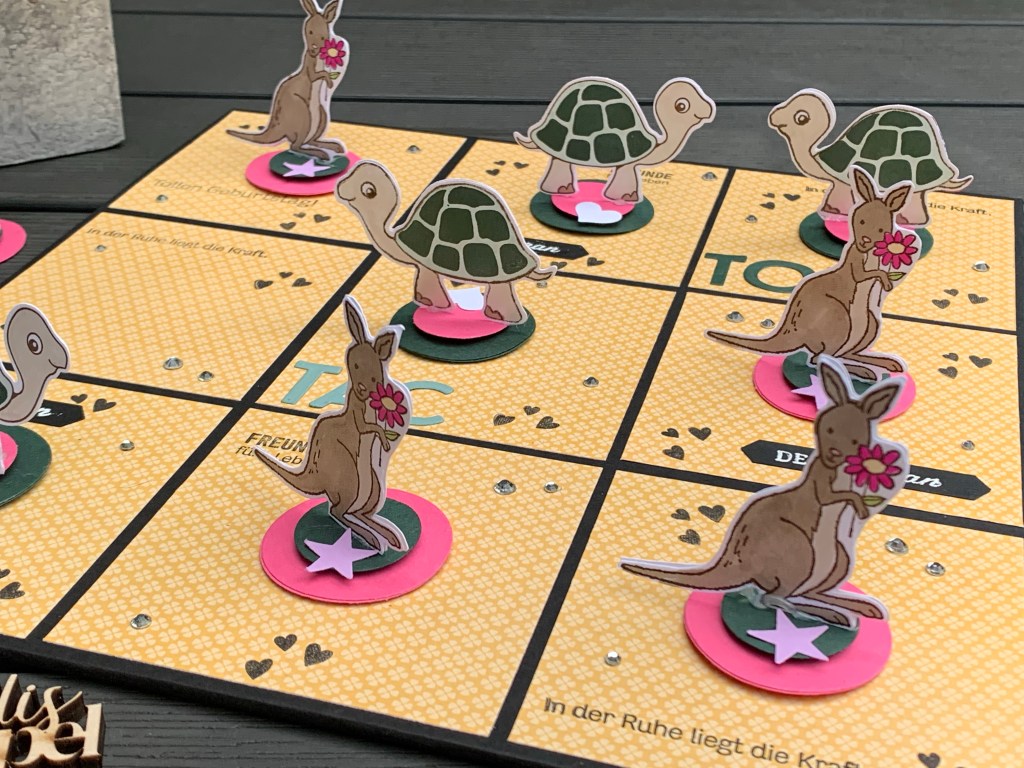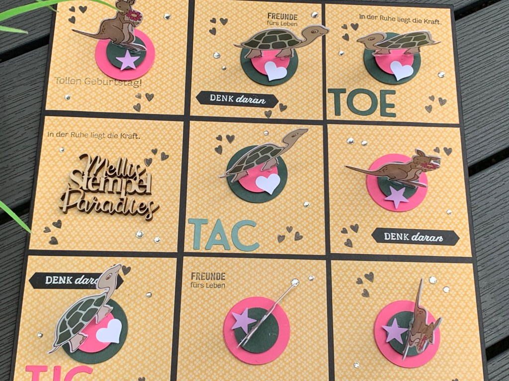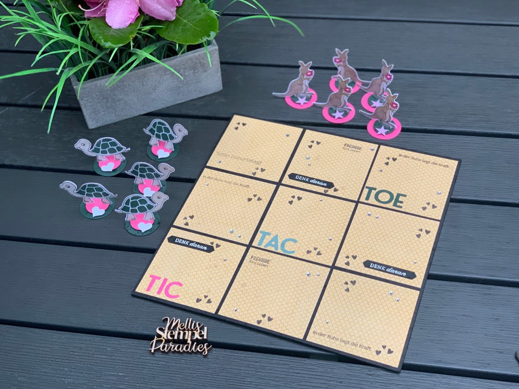 Ich habe mich mal für ein selbst gemachtes Spielbrett entschieden. Und zwar ein TIC TAC TOE Spiel. Dieses habe ich aus aktuellen Materialien gewerkelt plus etwas altem 😂 die Herz und die Stern Stanze ist alt