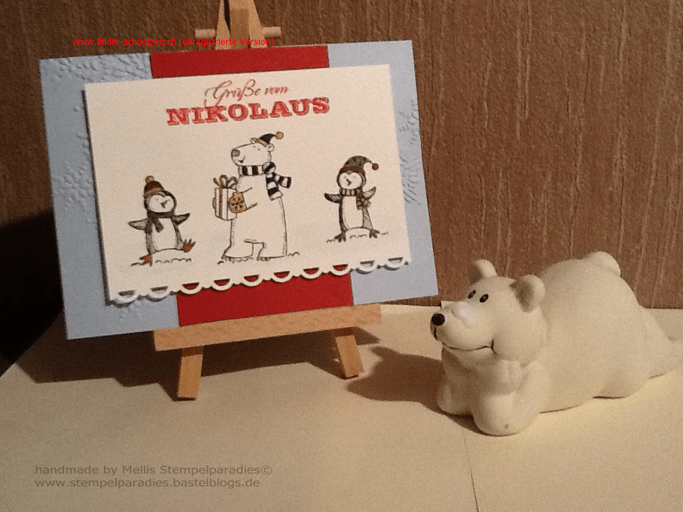 Eisbär ← Zurück Weiter → Material: Cardstock „Rotkäppchenrot“ Cardstock „Zartblau“ Cardstock „Flüsterweiß“ Stempel „Pol-Party“ Stempel „Grüße zum Fest“ Stanze „Häkelbordüre“ Alle InColor-Stifte 2012-2014 Bundstift in hellem Blau für das angedeutete Eis