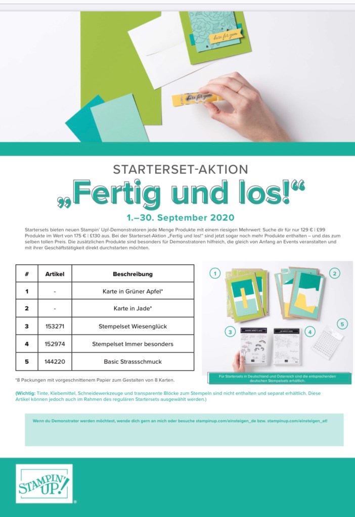 - In dem Set sind ausreichend Farbkarton für 16 Karten, eine Gratis-Packung Basic Strassschmuck in Schwarz, das Stempelset „Immer besonders“ und das Stempelset „Wiesenglück“ – alles für das erste eigene Event.