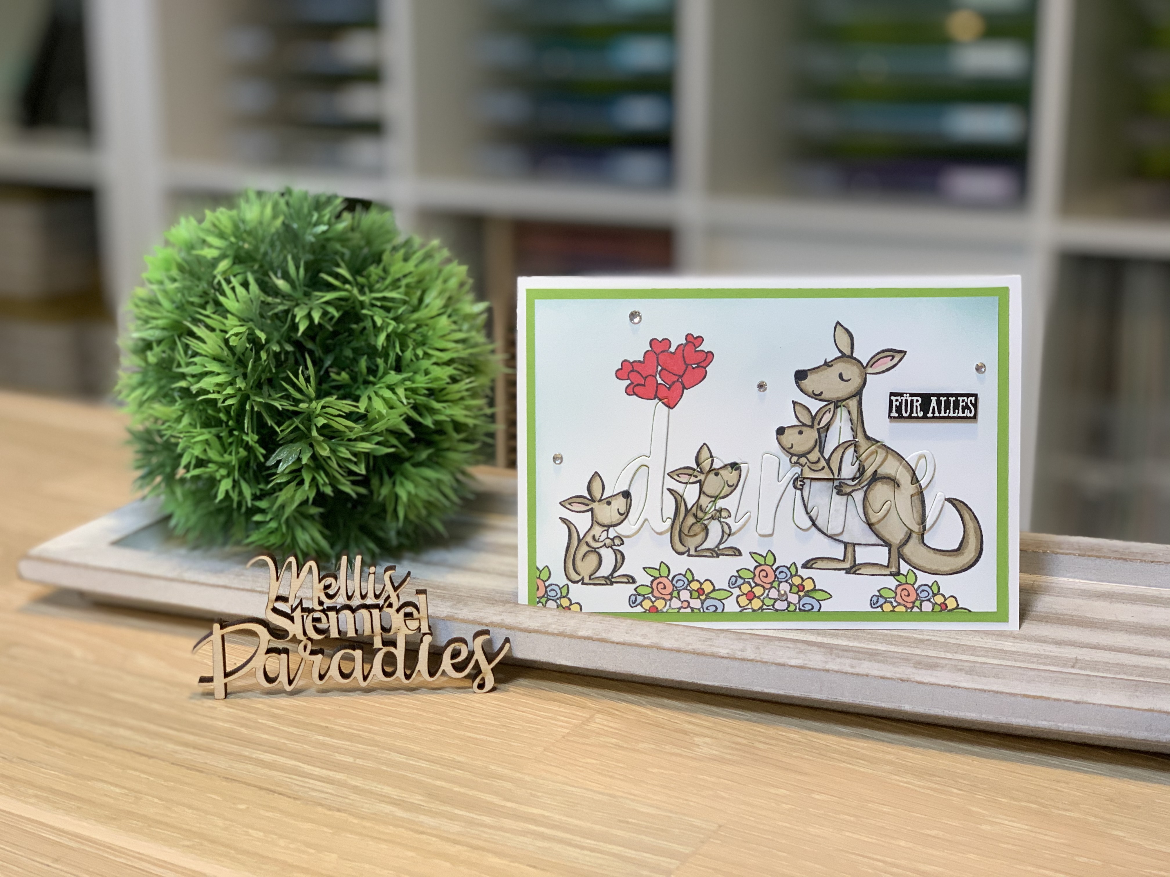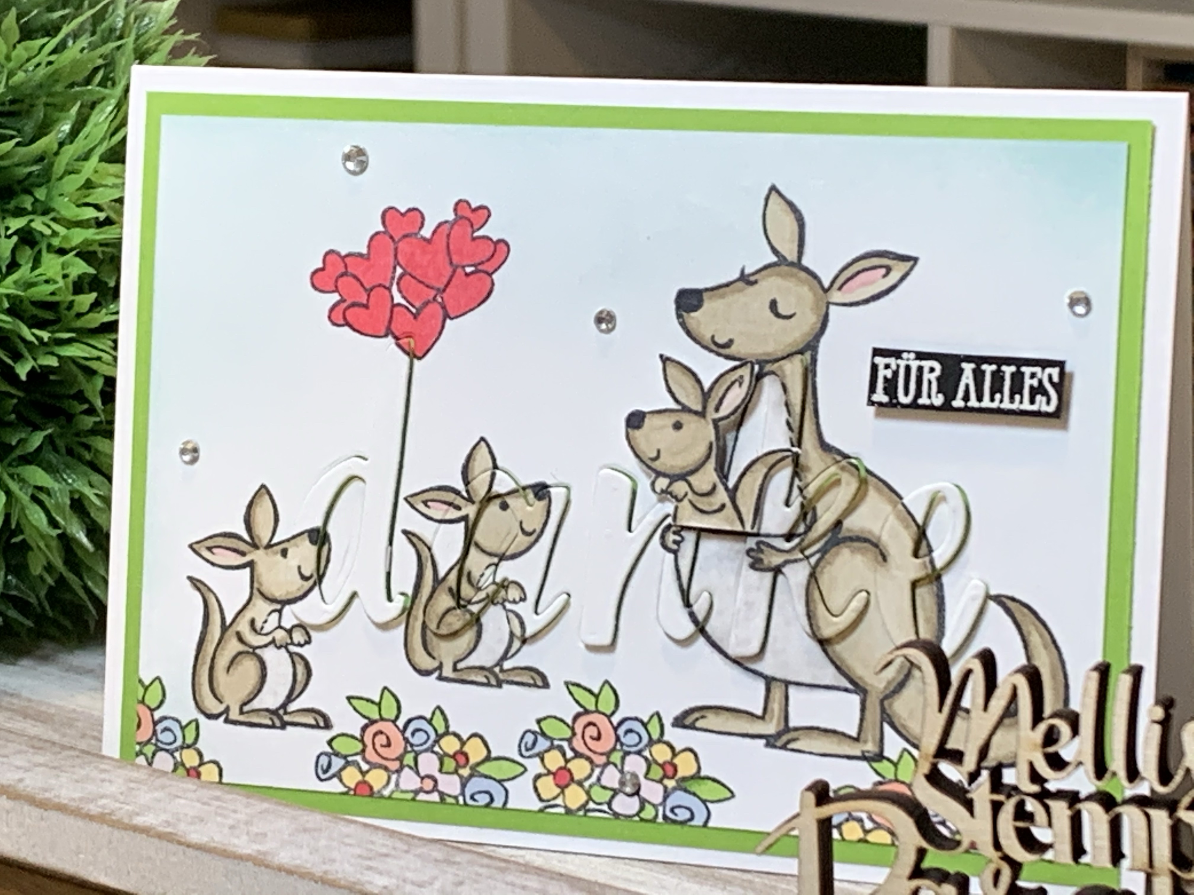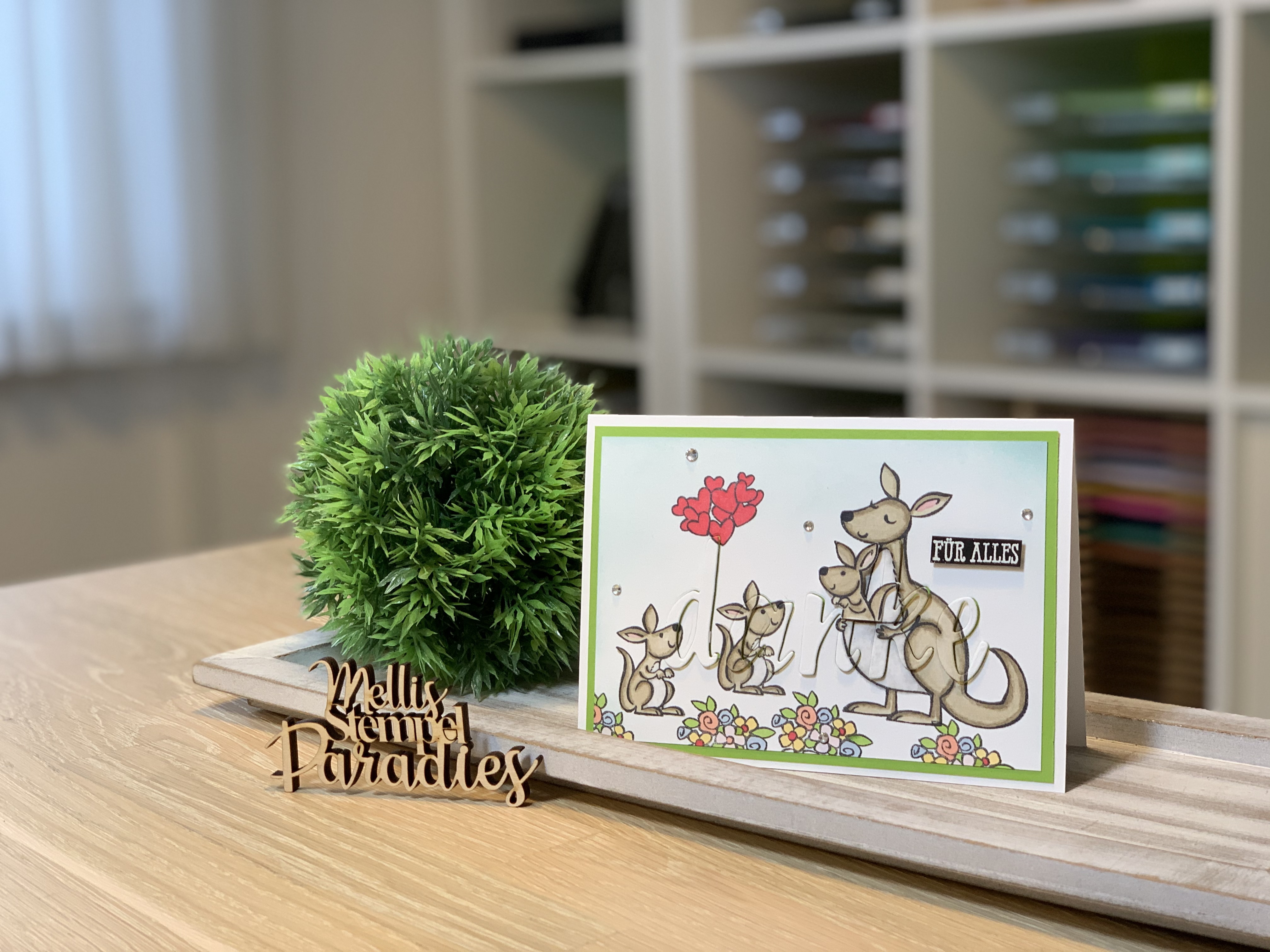 Ihr stempelt eure Motive auf Cardstock Grundweiß coloriert es eventuell.. so wie ich. Ich habe das „Stempelset Kangaroo & Company“ mit Memento Schwarz gestempelt und mit verschieden Stampin Blends coloriert.