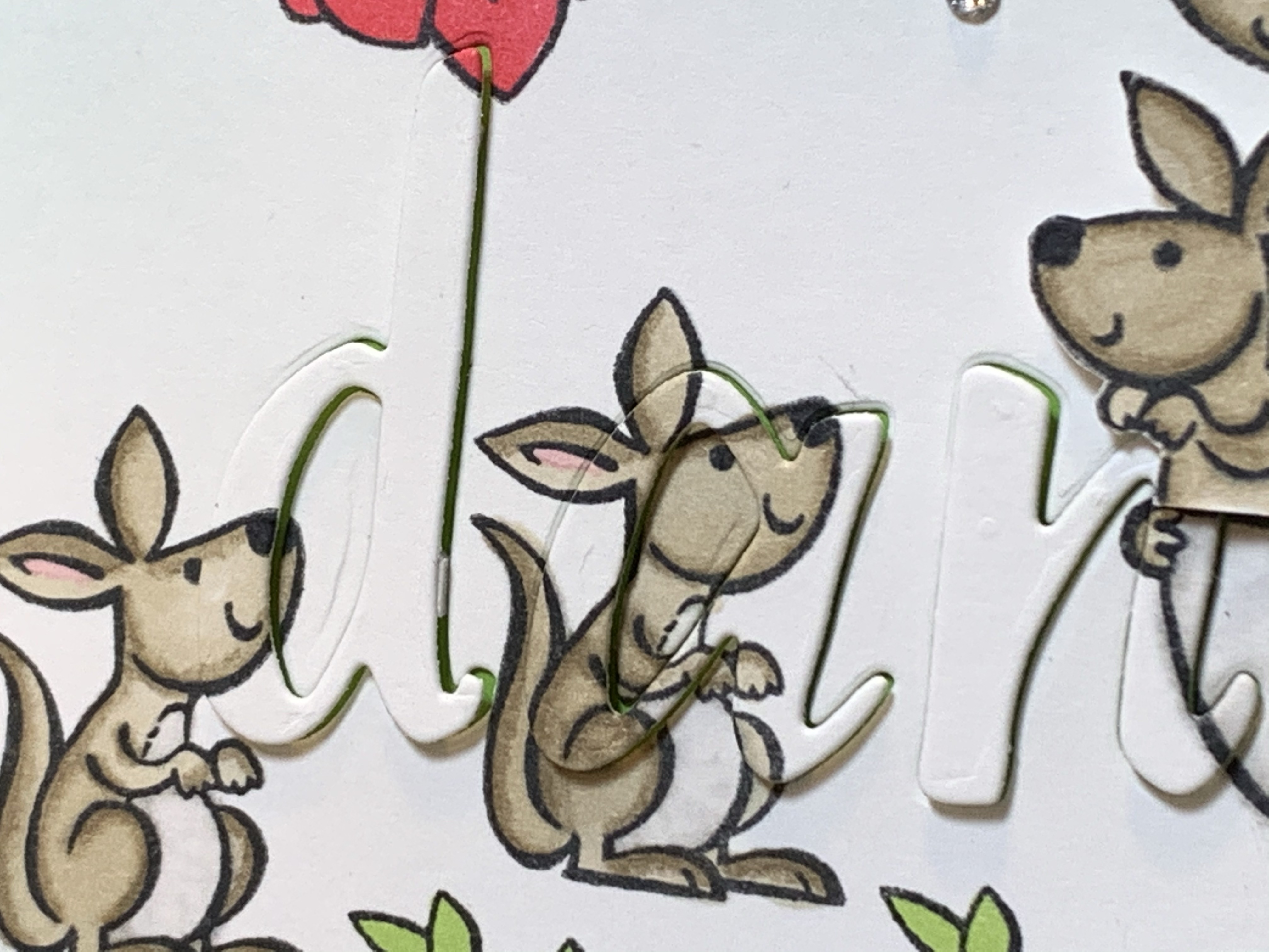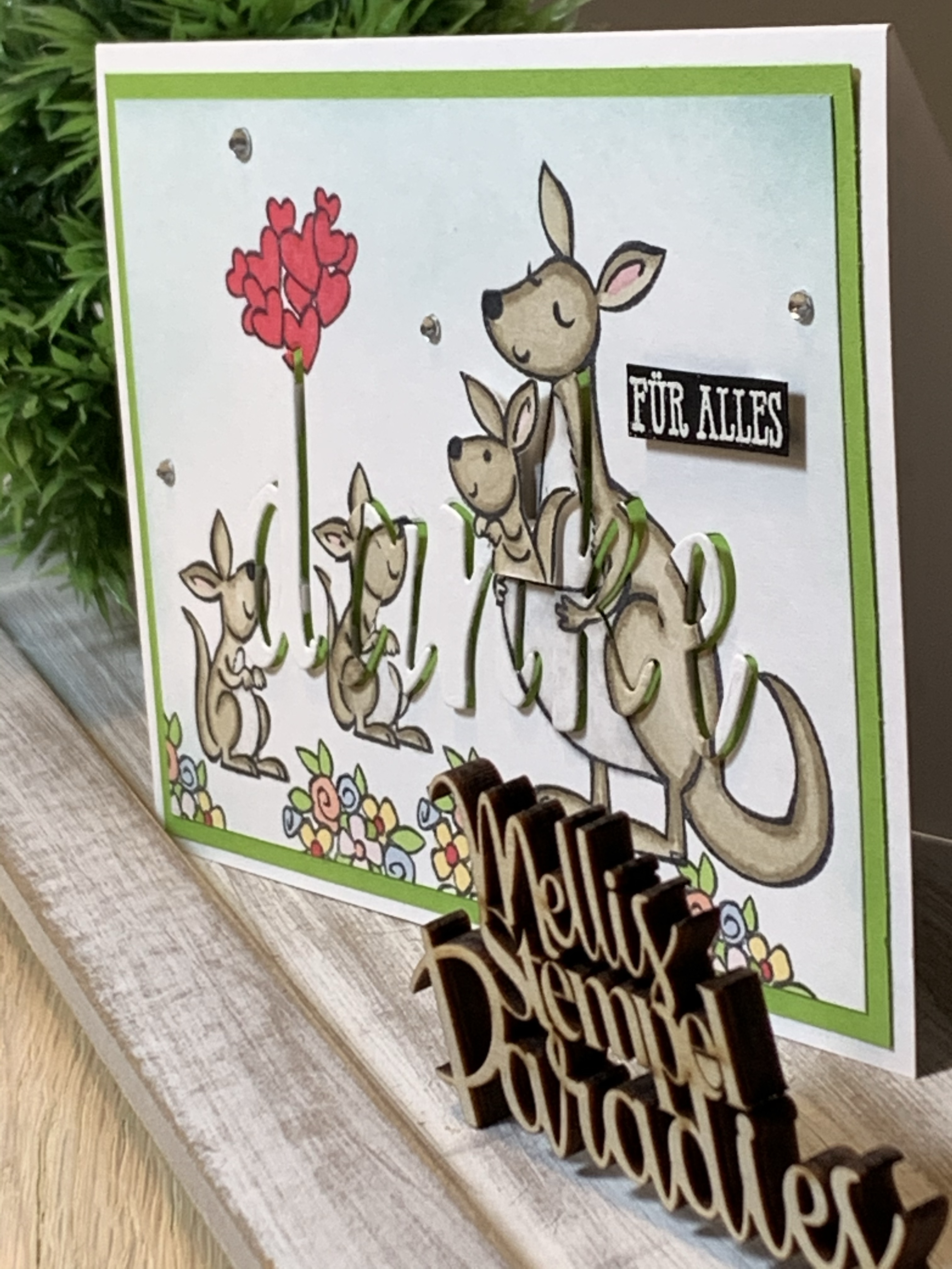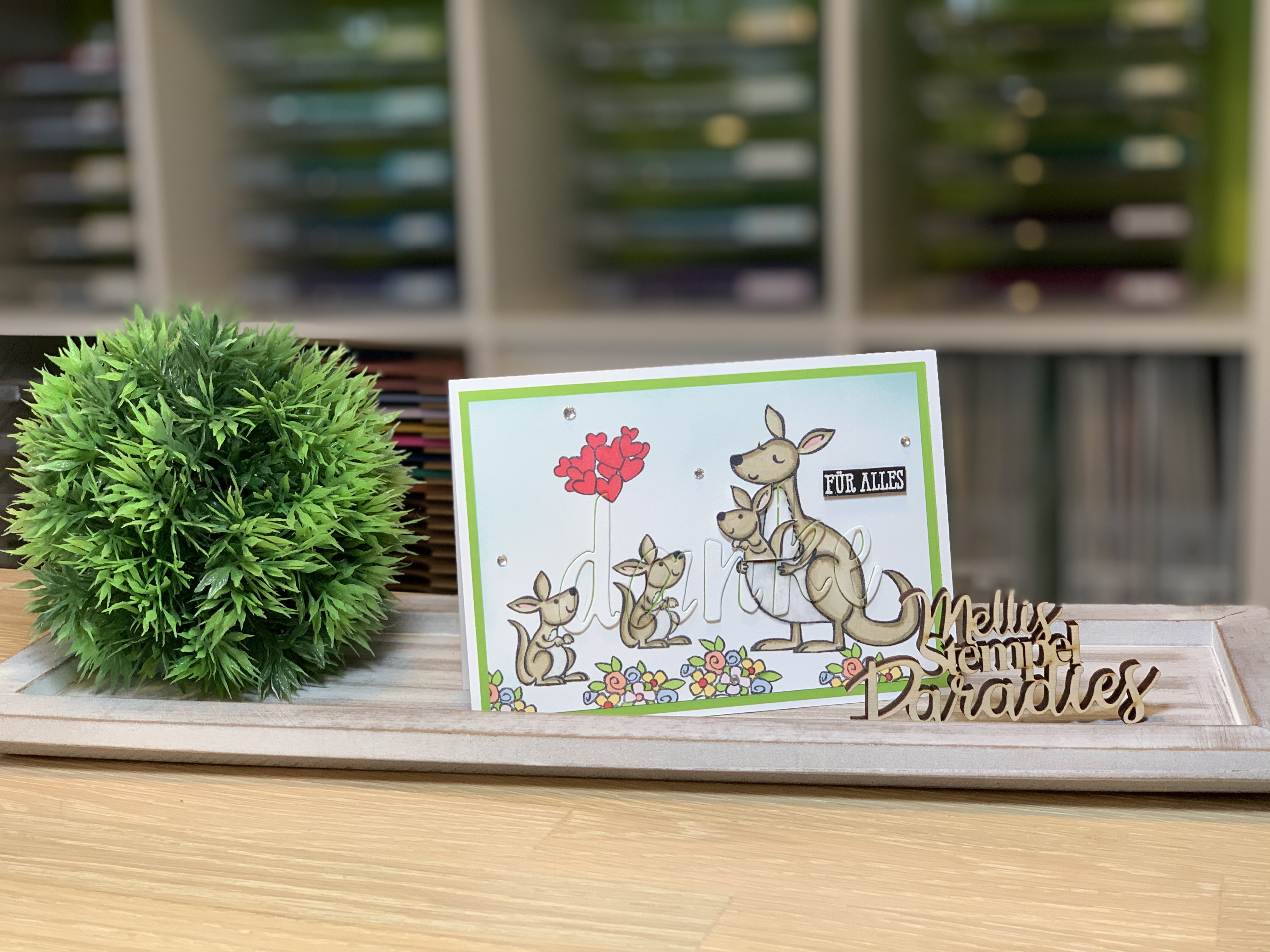 Ihr stempelt eure Motive auf Cardstock Grundweiß coloriert es eventuell.. so wie ich. Ich habe das „Stempelset Kangaroo & Company“ mit Memento Schwarz gestempelt und mit verschieden Stampin Blends coloriert.