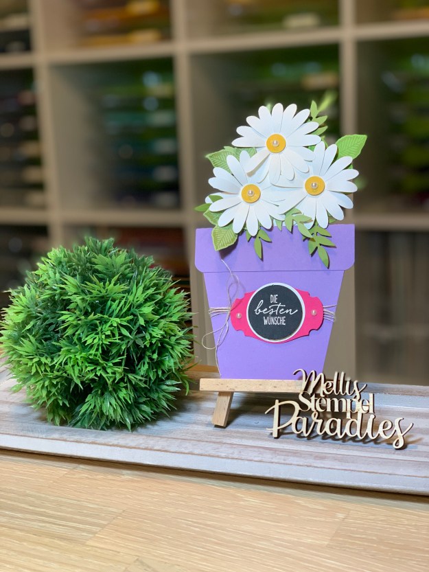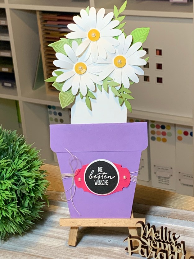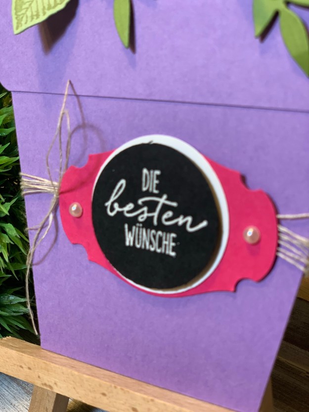 Die Karte ist wirklich richtig einfach zu machen mit wenig Mitteln und sie hat einen tollen Effekt. Ich habe mich an Frühlingshafte Farben gehalten wie Heideblüte, Grundweiß, Farngrün und Olivgrün für die Karte selber und Wassermelone und Schwarz und Weiß für das Grußetikett.