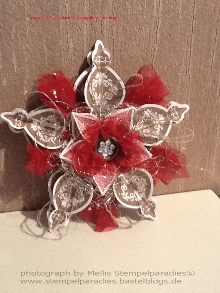 Stern Anke1 ← Zurück Weiter → Material: Cardstock „Flüsterweiß“ Stempelkissen „Wildleder“ Stempelkissen „Chili“ Framelits „Christbaumschmuck“ Stempel „Ornament Keepsakes“ Taftband „Chili“ Knopf „Mattbronze“ Basis Strassschmuck Leinenfaden Engelshaar ( nicht SU)