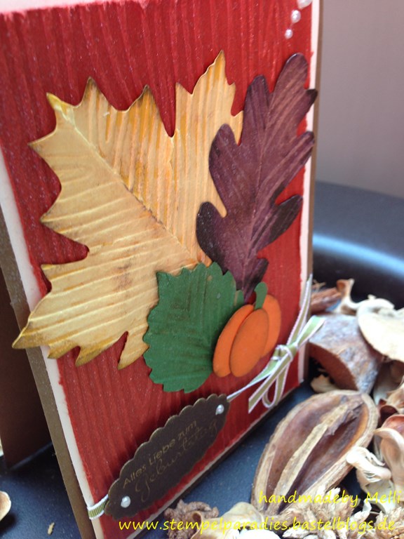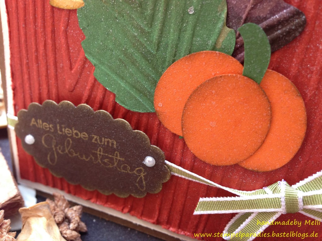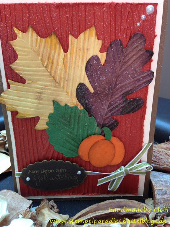Am Wochenende liegt ein Geburtstag an und da habe ich eine schnelle herbstliche Karte gewerkelt…geprägt, gestanzt und hinterher gesmoocht 🙂 glitzert in Wirklichkeit, auf dem Bild sieht man das schlecht.