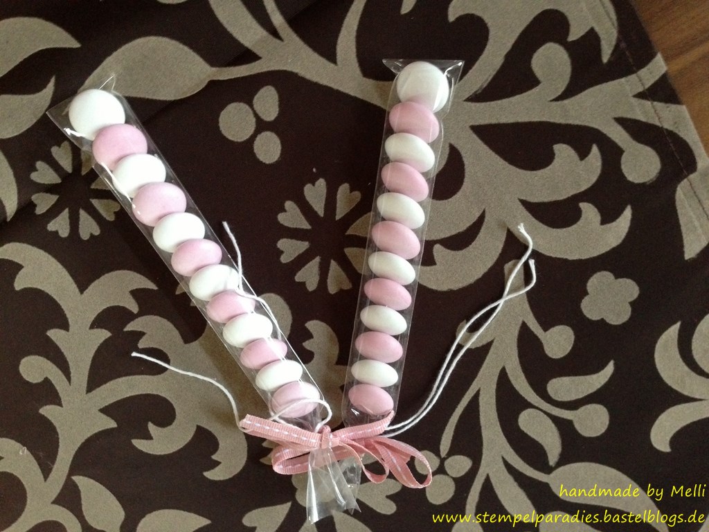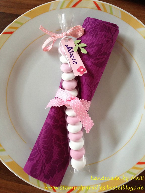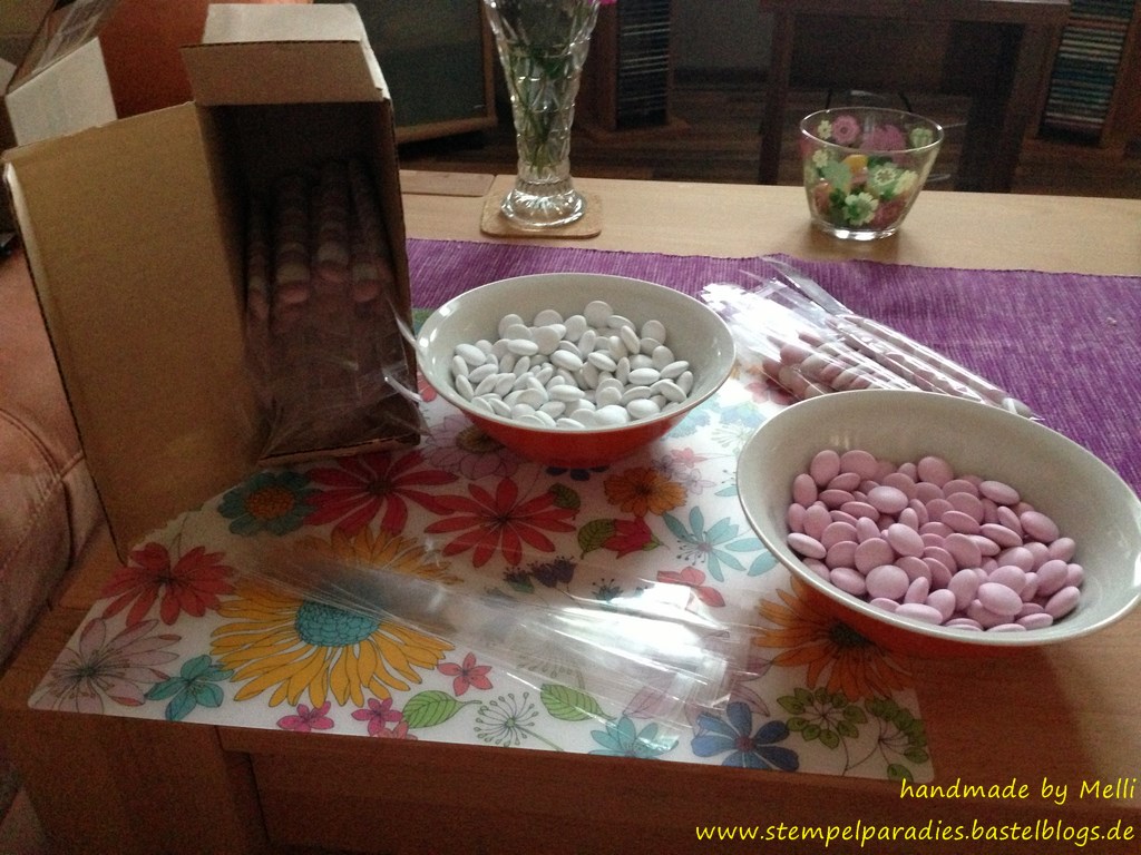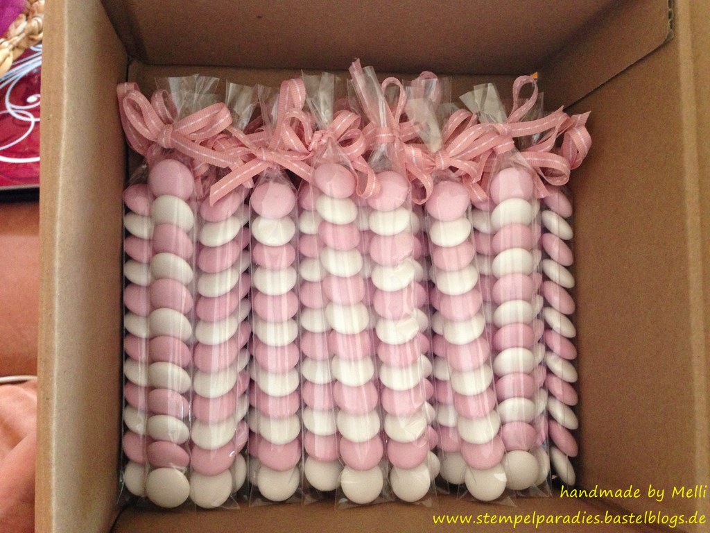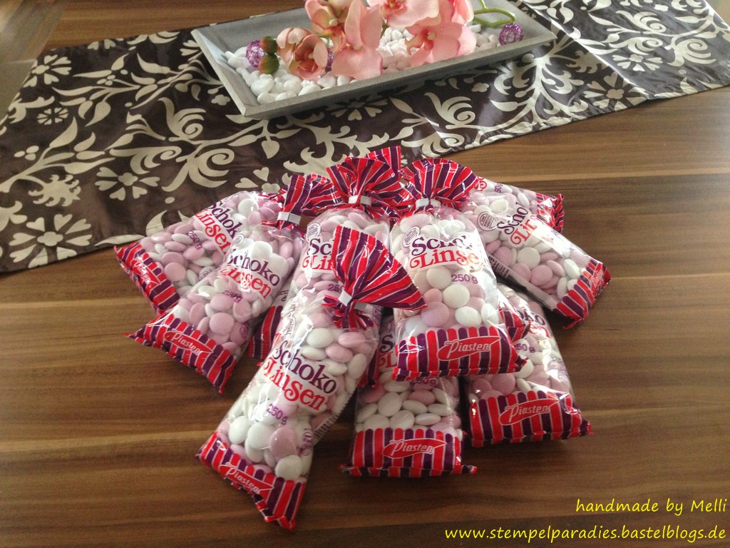 Die Kundin wollte gerne alles in Rosa-Tönen haben, passend zu der Gardrobe und Deko..Also hat sie sich für Schokolinsen entschieden…und wir haben kurz über Handy Fotos ausgetauscht, welcher Farbton von SU passt für die Schleife am Goodie..es passte  am besten Kirschblüte..und mit einer weißen Kordel, wo die Kundin hinterher noch das Namenschild anbringen kann..das macht sie nämlich selber:-)