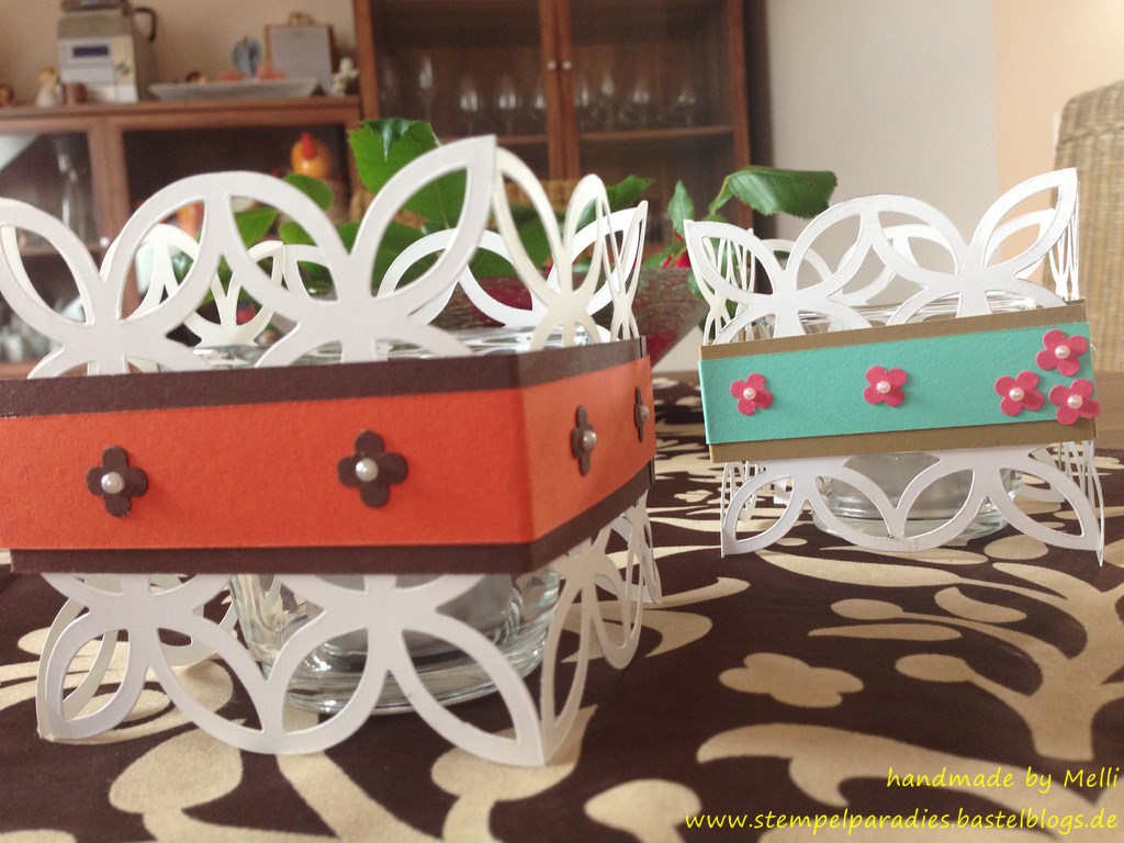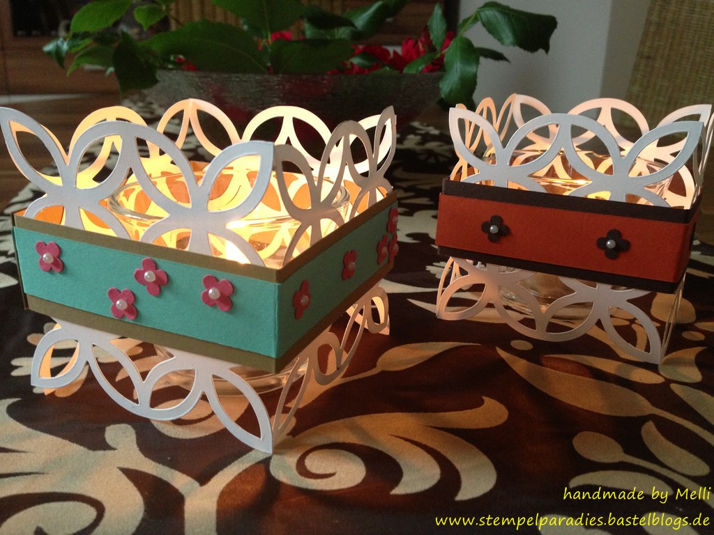 Ich finde sie sooo schön und ich habe für eins die neuen InColor Farben Jade, Kandiszucker und Rharbarberrot genommen und für das andere Schokobraun und Mandarinorange…die Gitter sind in Flüsterweiß ausgestanzt…
