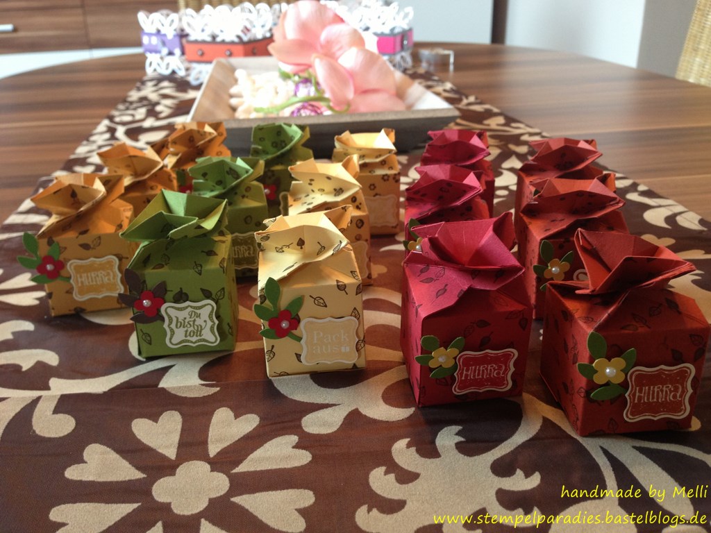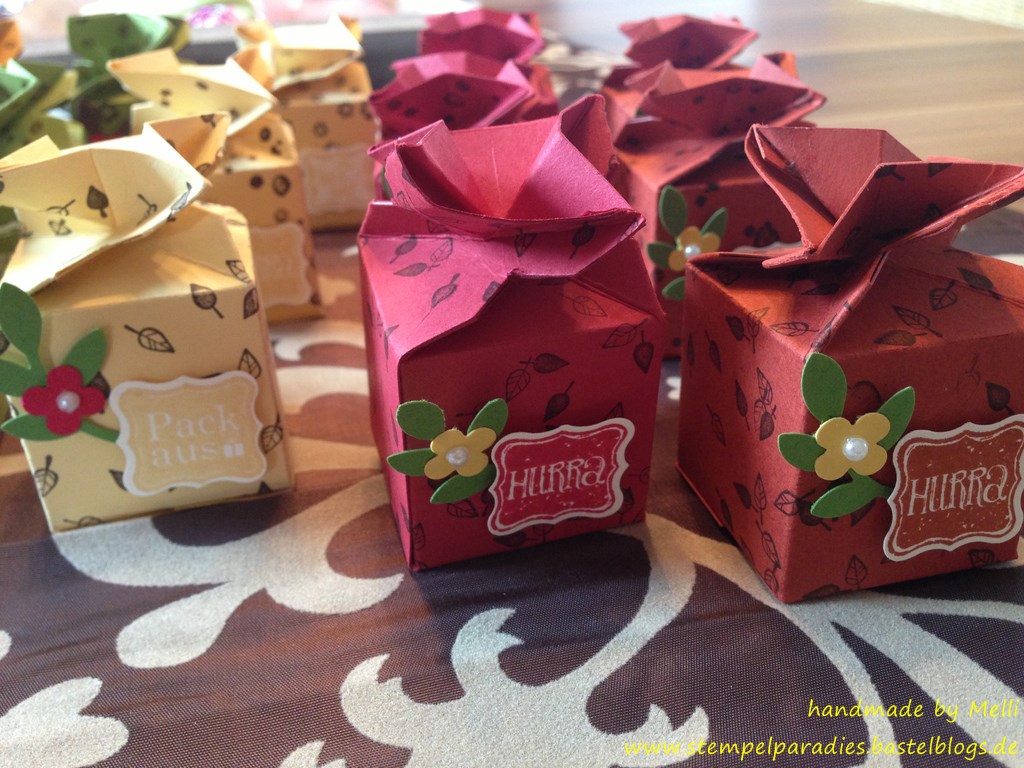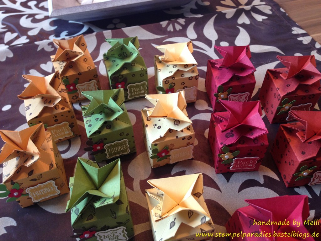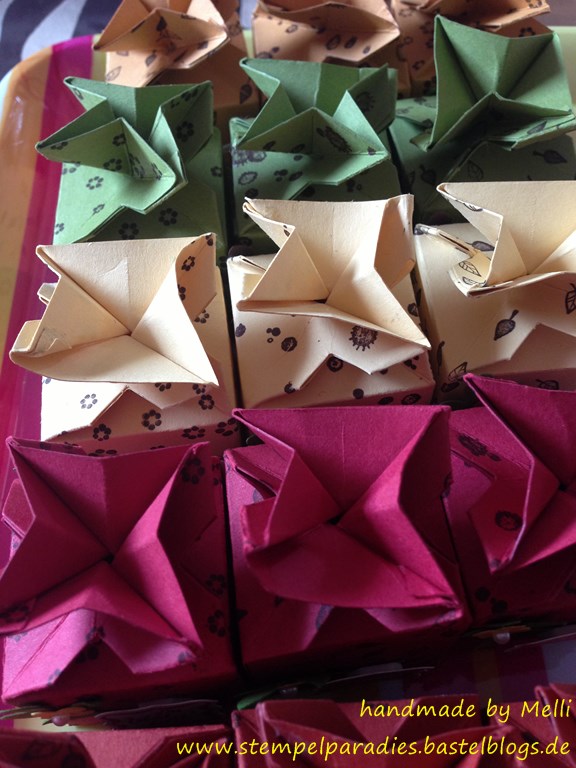 Habe mir 3 von den Framelits ausgesucht und mein fleissiger Elf hat sie für michin Himbeerrot und Schokobraun durch die Big Shot gejagt und die 2. Lage in Vanille für mich zugeschnitten und ich habe dann mit Links in Wildleder, Himbeerot, Kürbisgelb gestempelt und noch gewischt in Kürbisgelb, Curry-Geld, Himbeerrot und Savanne. und mir gefällts.