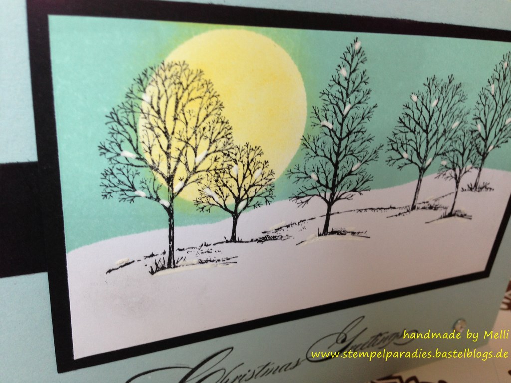 Mit Auqamarin und Schwarz und Weiß als Cardstock, und dann den Hintergrund mit der Brayer-Technik gestaltet und mit Maskentechnik den „Schnee“ total einfach und so ein toller Effekt! Den Schnee auf den Bäumen ist mit einem weißen Gelstift (nicht SU) gemacht worden.