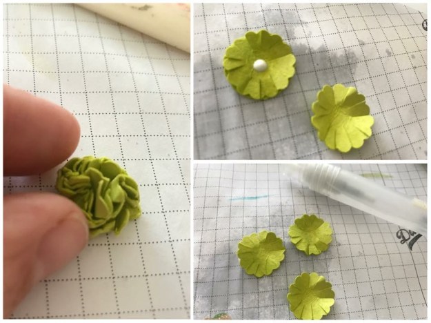 In Limette stanze ich noch 3 Wellenkreise mit der 7/8″ Stanze aus. Schneide sie ein, Feuchte sie an und klebe sie mit Kleber zusammen und knülle sie in Form und klebe sie auf die Gänseblümchen